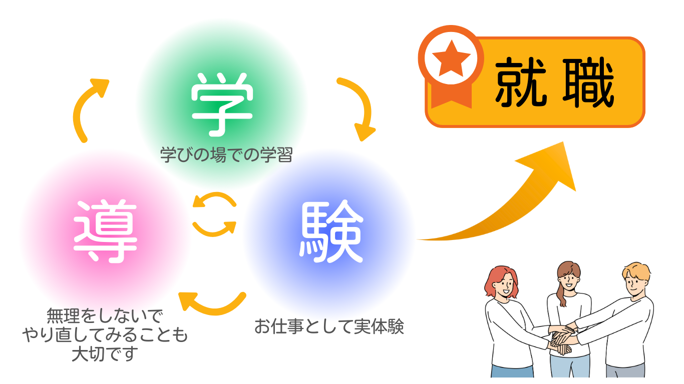 これまで未就労だった方や、再度の就職を目指される方へ、カレッジアンコラージュでの様々な職務体験であったり、ジョブステーションでの就労支援プログラムといった様々な経験を積んでいただき、ご自身の成長に合わせたタイミングでの就職を目指していきます。